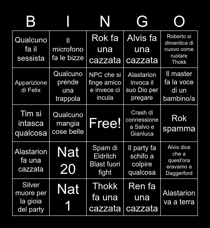 This bingo card has a free space and 24 words: Nat 20, Nat 1, NPC che si finge amico e invece ci incula, Silver muore per la gioia del party, Roberto si dimentica di nuovo come ruolare Thokk, Qualcuno fa il sessista, Apparizione di Felix, Il microfono fa le bizze, Crash di connessione a Salvo e Gianluca, Spam di Eldritch Blast fuori fight, Alastarion invoca il suo Dio per pregare, Tim si intasca qualcosa, Il party fa schifo a colpire qualcosa, Alvis dice che a quest'ora eravamo a Daggerford, Qualcuno prende una trappola, Ren fa una cazzata, Rok spamma, Rok fa una cazzata, Il master fa la voce di un bambino/a, Qualcuno mangia cose belle, Alastarion va a terra, Alastarion fa una cazzata, Alvis fa una cazzata and Thokk fa una cazzata.
