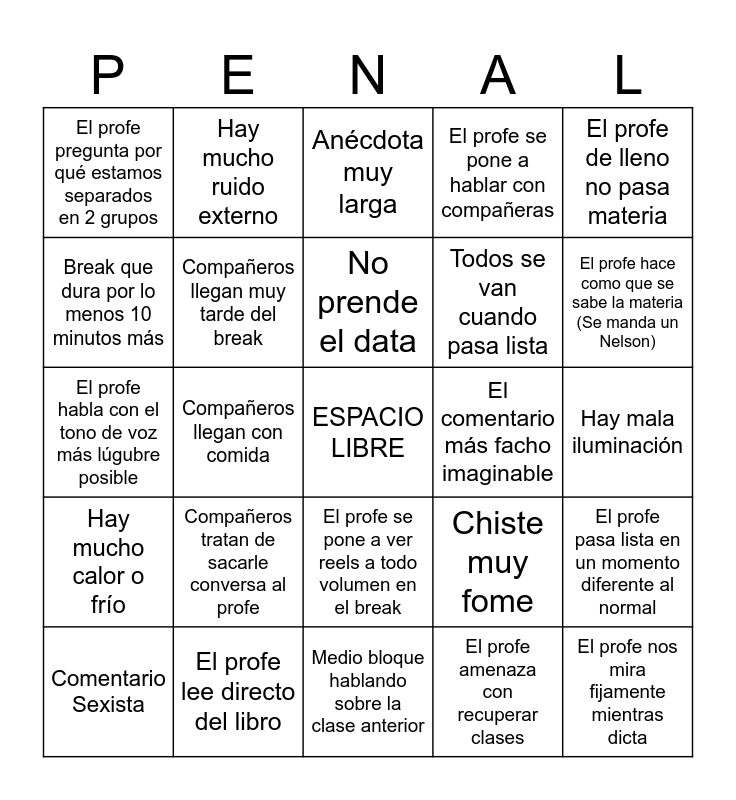 This bingo card has a free space and 24 words: Compañeros tratan de sacarle conversa al profe, El profe lee directo del libro, No prende el data, Comentario Sexista, El profe de lleno no pasa materia, El profe pregunta por qué estamos separados en 2 grupos, Break que dura por lo menos 10 minutos más, Hay mucho ruido externo, El comentario más facho imaginable, El profe se pone a ver reels a todo volumen en el break, Todos se van cuando pasa lista, El profe habla con el tono de voz más lúgubre posible, Chiste muy fome, El profe pasa lista en un momento diferente al normal, Compañeros llegan muy tarde del break, El profe amenaza con recuperar clases, Hay mala iluminación, Anécdota muy larga, El profe hace como que se sabe la materia (Se manda un Nelson), Compañeros llegan con comida, El profe nos mira fijamente mientras dicta, Hay mucho calor o frío, El profe se pone a hablar con compañeras and Medio bloque hablando sobre la clase anterior.
