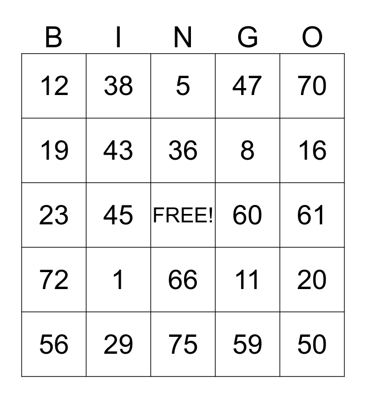 This bingo card has a free space and 24 words: 1, 29, 36, 56, 70, 12, 19, 38, 60, 66, 8, 23, 11, 20, 43, 59, 61, 5, 16, 45, 50, 72, 47 and 75.