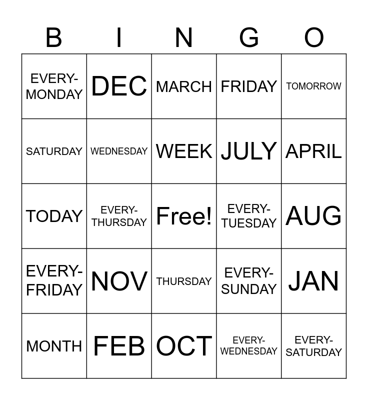 This bingo card has a free space and 35 words: SCHEDULE, MONDAY, TUESDAY, WEDNESDAY, THURSDAY, FRIDAY, SATURDAY, SUNDAY, WEEK, WEEK-END, TODAY, TOMORROW, YESTERDAY, TWO-DAYS-AGO, EVERY-MONDAY, EVERY-TUESDAY, EVERY-WEDNESDAY, EVERY-THURSDAY, EVERY-FRIDAY, EVERY-SATURDAY, EVERY-SUNDAY, MONTH, JAN, FEB, MARCH, APRIL, MAY, JUNE, JULY, AUG, SEPT, OCT, NOV, DEC and CALENDAR.