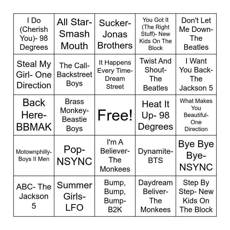 This bingo card has a free space and 38 words: Soda Pop- Saja Boys, I Want It That Way- Backstreet Boys, Everybody- Backstreet Boys, The Call- Backstreet Boys, Bye Bye Bye- NSYNC, Pop- NSYNC, It Happens Every Time- Dream Street, Come Together- The Beatles, Don't Let Me Down- The Beatles, Twist And Shout- The Beatles, Brass Monkey- Beastie Boys, You Got It (The Right Stuff)- New Kids On The Block, Step By Step- New Kids On The Block, What Makes You Beautiful- One Direction, Steal My Girl- One Direction, Motownphilly- Boys II Men, Burnin Up- Jonas Brothers, Sucker- Jonas Brothers, If It Isn't Love- New Edition, Heat It Up- 98 Degrees, I Do (Cherish You)- 98 Degrees, Summer Girls- LFO, I Want You Back- The Jackson 5, ABC- The Jackson 5, MMMBop- Hanson, Bump, Bump, Bump- B2K, Boyfriend- Big Time Rush, She Looks So Perfect- 5 Seconds Of Summer, Glad You Came- The Wanted, Dear Maria, Count Me In- All Time Low, No Diggity- Blackstreet, I'm A Believer- The Monkees, Daydream Beliver- The Monkees, All Star- Smash Mouth, Year 3000- Jonas Brothers, Dynamite- BTS, Back Here- BBMAK and Truly Madly Deeply- Savage Garden.