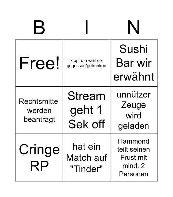This bingo card has 9 words: Cringe RP, Sushi Bar wir erwähnt, kippt um weil nix gegessen/getrunken, Rechtsmittel werden beantragt, Free!, unnützer Zeuge wird geladen, Stream geht 1 Sek off, Hammond teilt seinen Frust mit mind. 2 Personen and hat ein Match auf "Tinder".