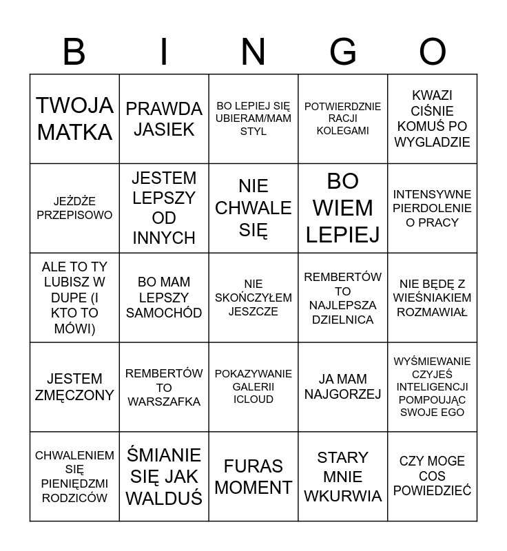 This bingo card has a free space and 29 words: CHWALENIEM SIĘ PIENIĘDZMI RODZICÓW, BO TY NIE MASZ PRAWA JAZDY, BO MAM LEPSZY SAMOCHÓD, GARDZE KAŻDYM, TWOJA MATKA, BO LEPIEJ SIĘ UBIERAM/MAM STYL, JESTEM LEPSZY OD INNYCH, REMBERTÓW TO WARSZAFKA, REMBERTÓW TO NAJLEPSZA DZIELNICA, ŚMIANIE SIĘ JAK WALDUŚ, NIE BĘDĘ Z WIEŚNIAKIEM ROZMAWIAŁ, CZY MOGE COS POWIEDZIEĆ, FURAS MOMENT, STARY MNIE WKURWIA, INTENSYWNE PIERDOLENIE O PRACY, UDAWANIE ZNAWCY MOTORYZACJI, POKAZYWANIE GALERII ICLOUD, JESTEM ZMĘCZONY, KWAZI CIŚNIE KOMUŚ PO WYGLADZIE, ALE TO TY LUBISZ W DUPE (I KTO TO MÓWI), JA MAM NAJGORZEJ, NIE JESTEM TWINKIEM, BO WIEM LEPIEJ, JEŻDŻE PRZEPISOWO, POTWIERDZNIE RACJI KOLEGAMI, PRAWDA JASIEK, WYŚMIEWANIE CZYJEŚ INTELIGENCJI POMPOUJĄC SWOJE EGO, NIE CHWALE SIĘ and INSYNUOWANIE KOMUŚ ROZWIĄZŁOŚCI ŁÓŻKOWEJ.