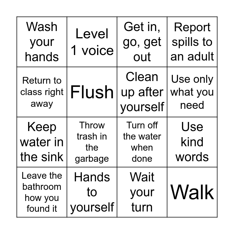 This bingo card has 22 words: Hands to yourself, Feet only on the floor, Level 1 voice, Honor privacy, Flush, Clean up after yourself, Wash your hands, Get in, go, get out, Turn off the water when done, Walk, Keep water in the sink, Report spills to an adult, Use soap and paper towels, Keep your body in your own space, Wait your turn, Knock before entering a stall, Use kind words, Leave the bathroom how you found it, Throw trash in the garbage, Return to class right away, Use only what you need and Follow adult directions.