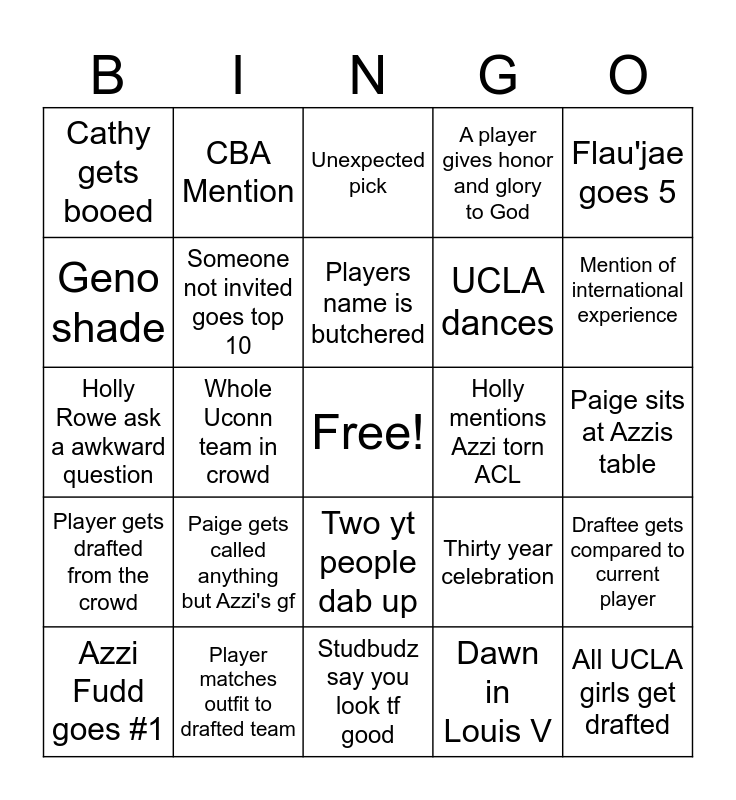 This bingo card has a free space and 24 words: Azzi Fudd goes #1, Paige gets called anything but Azzi's gf, Players name is butchered, Dawn in Louis V, Flau'jae goes 5, Cathy gets booed, CBA Mention, Unexpected pick, Holly mentions Azzi torn ACL, Paige sits at Azzis table, Holly Rowe ask a awkward question, Someone not invited goes top 10, Thirty year celebration, Draftee gets compared to current player, Geno shade, Player matches outfit to drafted team, Studbudz say you look tf good, A player gives honor and glory to God, Mention of international experience, Player gets drafted from the crowd, Whole Uconn team in crowd, Two yt people dab up, UCLA dances and All UCLA girls get drafted.