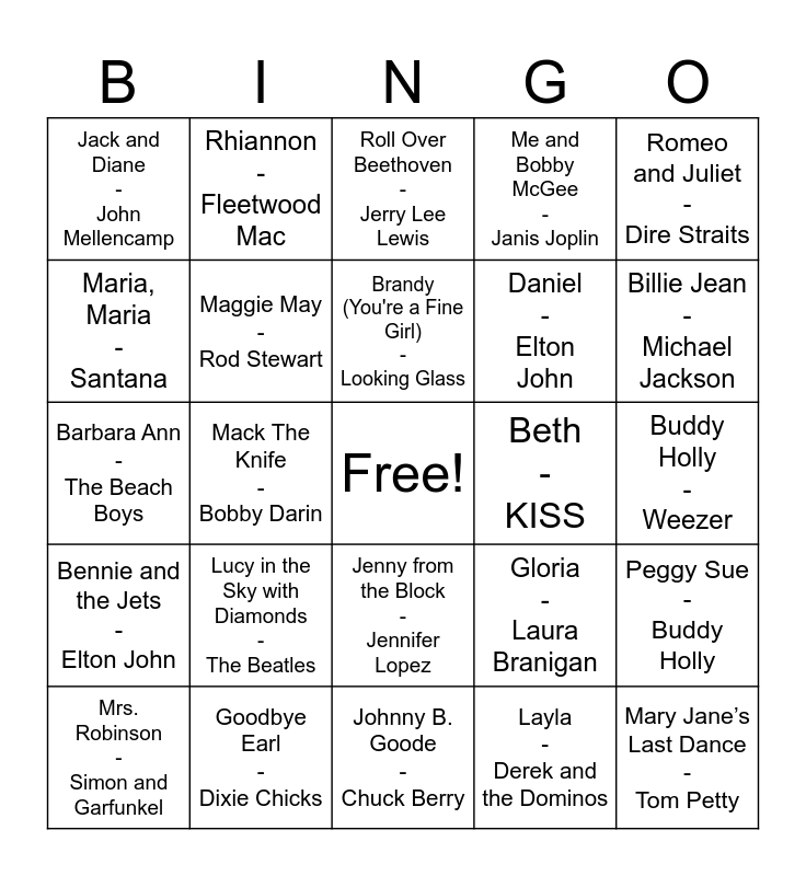 This bingo card has a free space and 71 words: Come On, Eileen - Dexy’s Midnight Runners, Rhiannon - Fleetwood Mac, Eleanor Rigby - The Beatles, Runaround Sue - Dion, Johnny B. Goode - Chuck Berry, Darling Nikki - Prince, Me and Bobby McGee - Janis Joplin, Sweet Caroline - Neil Diamond, Daniel - Elton John, Me and Julio Down by the Schoolyard - Paul Simon, Mrs. Robinson - Simon and Garfunkel, Fernando - ABBA, Billie Jean - Michael Jackson, Jack and Diane - John Mellencamp, Mickey - Toni Basil, Barbara Ann - The Beach Boys, Gloria - Laura Branigan, Romeo and Juliet - Dire Straits, The Wind Cries Mary - Jimi Hendrix, Buddy Holly - Weezer, Lucy in the Sky with Diamonds - The Beatles, Mary Jane’s Last Dance - Tom Petty, Peggy Sue - Buddy Holly, Alejandro - Lady Gaga, Dirty Diana - Michael Jackson, Diana - One Direction, Nancy Mulligan - Ed Sheeran, Valerie - Amy Winehouse, Iris - The Goo Goo Dolls, Stacy’s Mom - Fountains of Wayne, Goodbye Earl - Dixie Chicks, Jolene - Dolly Parton, Roseanna - Toto, Hey Jude - The Beatles, Layla - Derek and the Dominos, Roxanne - The Police, Hey There Delilah - Plain White T’s, Delilah - Tom Jones, Maria, Maria - Santana, Proud Mary - Ike & Tina Turner, Jenny from the Block - Jennifer Lopez, Sara Smile - Hall & Oates, Bennie and the Jets - Elton John, My Cherie Amour - Stevie Wonder, Mary Jane - Rick James, Lido Shuffle - Boz Scaggs, Lola - The Kinks, Maggie May - Rod Stewart, 867-5309 (Jenny) - Tommy Tutone, Amanda - Boston, Baba O'Riley - The Who, Bad, Bad, Leroy Brown - Jim Croce, Beth - KISS, Bette Davis Eyes - Kim Carnes, Black Betty - Ram Jam, A Boy Named Sue - Johnny Cash, Brandy (You're a Fine Girl) - Looking Glass, Cecilia - Simon and Garfunkel, Cracklin' Rosie - Neil Diamond, Elivra - Oak Ridge Boys, Janie's Got a Gun - Aerosmith, Jessie's Girl - Rick Springfield, Mack The Knife - Bobby Darin, Movin' Out (Anthony's Song) - Billy Joel, Mustang Sally - Wilson Pickett, My Sharona - The Knack, Roll Over Beethoven - Jerry Lee Lewis, Sir Duke - Stevie Wonder, Tom Sawyer - Rush, Wake Up Little Susie - Everly Brothers and You Can Call Me Al - Paul Simon.