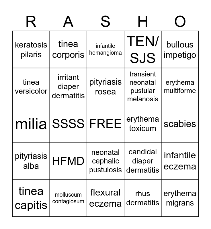 This bingo card has a free space and 24 words: HFMD, molluscum contagiosum, pityriasis rosea, tinea capitis, bullous impetigo, keratosis pilaris, tinea versicolor, tinea corporis, erythema toxicum, neonatal cephalic pustulosis, transient neonatal pustular melanosis, milia, candidal diaper dermatitis, infantile eczema, irritant diaper dermatitis, rhus dermatitis, scabies, infantile hemangioma, erythema multiforme, SSSS, erythema migrans, pityriasis alba, TEN/ SJS and flexural eczema.