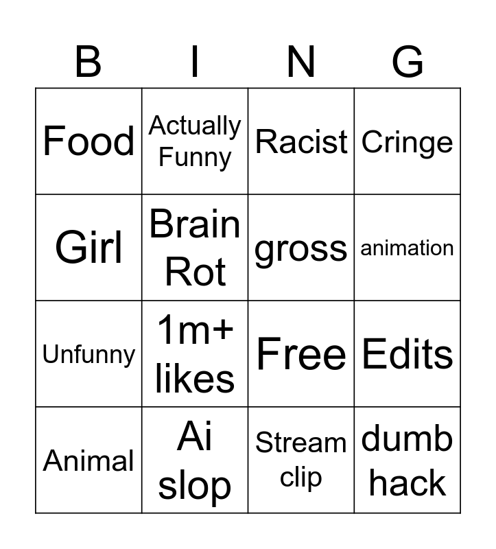 This bingo card has 16 words: Ai slop, Edits, Racist, Food, Unfunny, Actually Funny, Free, Stream clip, Girl, Brain Rot, Animal, Cringe, 1m+ likes, animation, gross and dumb hack.