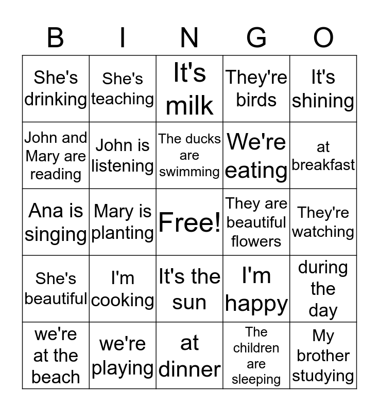 This bingo card has a free space and 24 words: I'm cooking, we're playing, The ducks are swimming, we're at the beach, It's shining, She's drinking, John and Mary are reading, She's teaching, They are beautiful flowers, It's the sun, We're eating, Ana is singing, I'm happy, during the day, John is listening, The children are sleeping, They're watching, It's milk, at breakfast, Mary is planting, My brother studying, She's beautiful, They're birds and at dinner.