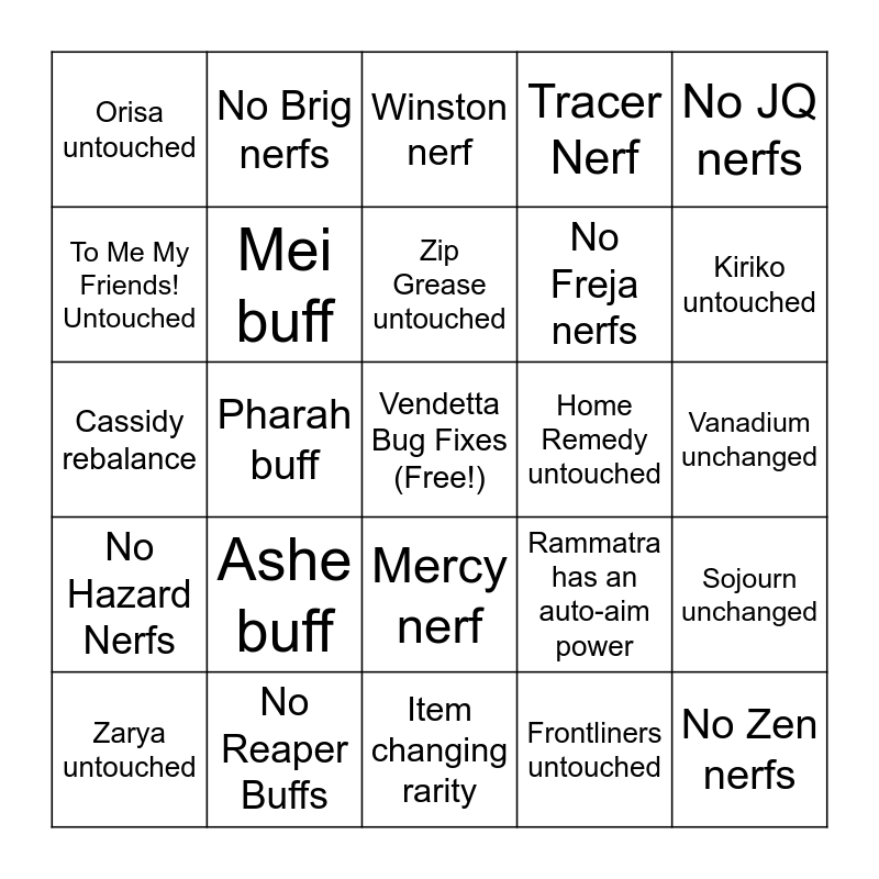 This bingo card has a free space and 24 words: Ashe buff, No Reaper Buffs, Zip Grease untouched, Zarya untouched, No JQ nerfs, Orisa untouched, To Me My Friends! Untouched, No Brig nerfs, Home Remedy untouched, Mercy nerf, No Freja nerfs, Cassidy rebalance, Rammatra has an auto-aim power, Sojourn unchanged, Mei buff, Frontliners untouched, Vanadium unchanged, Winston nerf, Kiriko untouched, Pharah buff, No Zen nerfs, No Hazard Nerfs, Tracer Nerf and Item changing rarity.