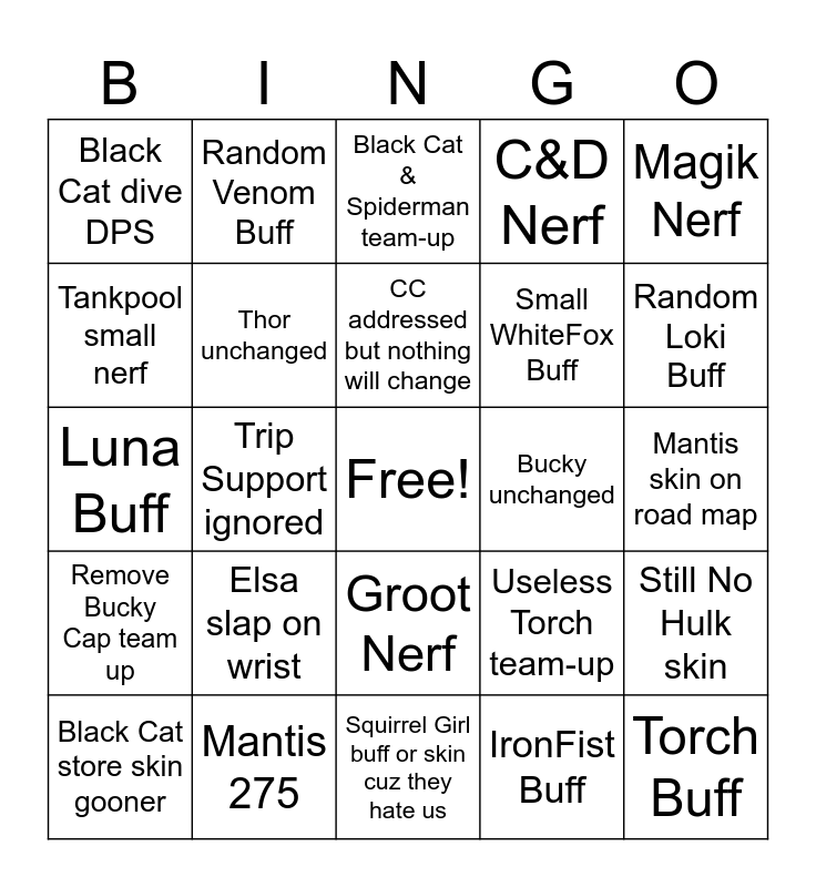 This bingo card has a free space and 24 words: Elsa slap on wrist, Mantis 275, CC addressed but nothing will change, Black Cat store skin gooner, Magik Nerf, Black Cat dive DPS, Tankpool small nerf, Random Venom Buff, Bucky unchanged, Groot Nerf, Small WhiteFox Buff, Luna Buff, Useless Torch team-up, Still No Hulk skin, Thor unchanged, IronFist Buff, Mantis skin on road map, Black Cat & Spiderman team-up, Random Loki Buff, Trip Support ignored, Torch Buff, Remove Bucky Cap team up, C&D Nerf and Squirrel Girl buff or skin cuz they hate us.