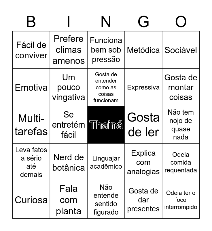This bingo card has a free space and 24 words: Nerd de botânica, Fala com planta, Gosta de entender como as coisas funcionam, Curiosa, Sociável, Fácil de conviver, Emotiva, Prefere climas amenos, Gosta de ler, Linguajar acadêmico, Expressiva, Multi-tarefas, Explica com analogias, Odeia comida requentada, Um pouco vingativa, Gosta de dar presentes, Não tem nojo de quase nada, Funciona bem sob pressão, Gosta de montar coisas, Se entretém fácil, Odeia ter o foco interrompido, Leva fatos a sério até demais, Metódica and Não entende sentido figurado.