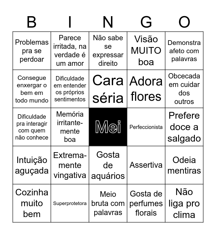 This bingo card has a free space and 24 words: Extrema-mente vingativa, Superprotetora, Cara séria, Cozinha muito bem, Demonstra afeto com palavras, Problemas pra se perdoar, Consegue enxergar o bem em todo mundo, Parece irritada, na verdade é um amor, Perfeccionista, Gosta de aquários, Adora flores, Dificuldade pra interagir com quem não conhece, Assertiva, Odeia mentiras, Dificuldade em entender os próprios sentimentos, Gosta de perfumes florais, Prefere doce a salgado, Não sabe se expressar direito, Obcecada em cuidar dos outros, Memória irritante-mente boa, Não liga pro clima, Intuição aguçada, Visão MUITO boa and Meio bruta com palavras.