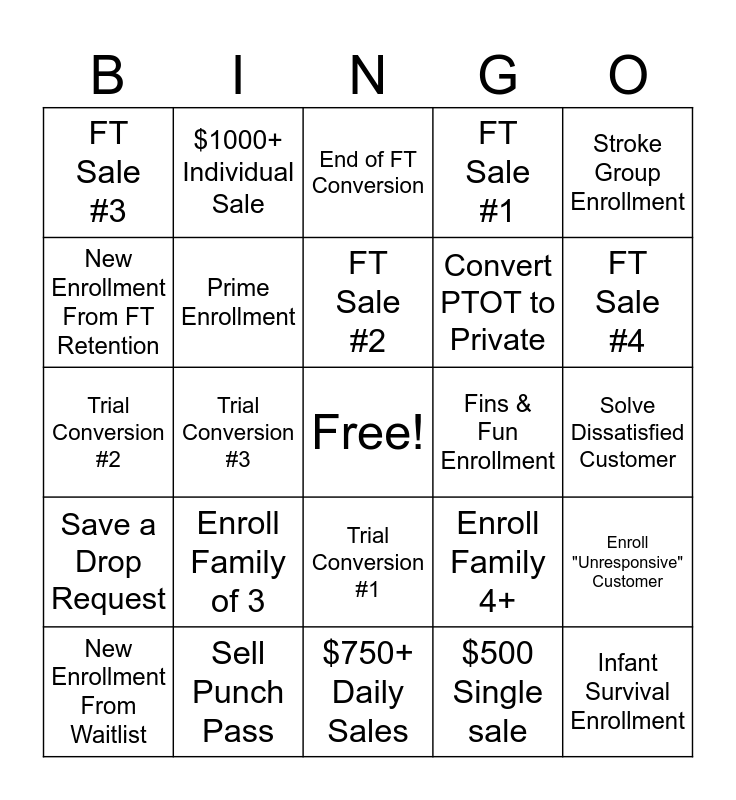 This bingo card has a free space and 24 words: Enroll Family of 3, Sell Punch Pass, FT Sale #2, New Enrollment From Waitlist, Stroke Group Enrollment, FT Sale #3, New Enrollment From FT Retention, $1000+ Individual Sale, Fins & Fun Enrollment, Trial Conversion #1, Convert PTOT to Private, Trial Conversion #2, Enroll Family 4+, Enroll "Unresponsive" Customer, Prime Enrollment, $500 Single sale, Solve Dissatisfied Customer, End of FT Conversion, FT Sale #4, Trial Conversion #3, Infant Survival Enrollment, Save a Drop Request, FT Sale #1 and $750+ Daily Sales.