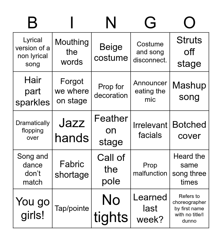 This bingo card has a free space and 24 words: You go girls!, Fabric shortage, Prop for decoration, Learned last week?, Struts off stage, Lyrical version of a non lyrical song, Mouthing the words, Beige costume, Irrelevant facials, Botched cover, Dramatically flopping over, Forgot we where on stage, Prop malfunction, Heard the same song three times, Hair part sparkles, Tap/pointe, No tights, Costume and song disconnect., Mashup song, Song and dance don’t match, Jazz hands, Call of the pole, Announcer eating the mic and Refers to choreographer by first name with no title/I dunno.