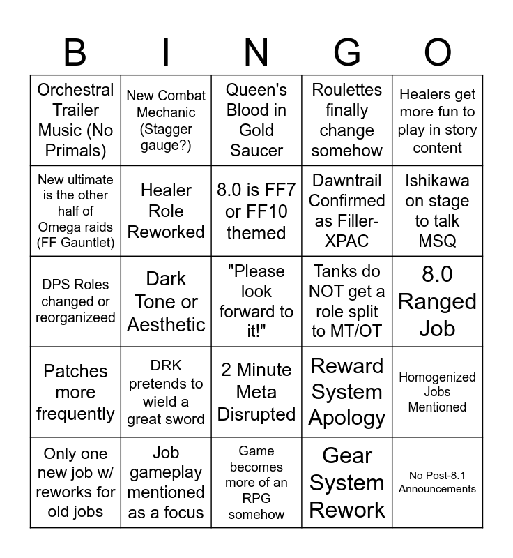 This bingo card has a free space and 24 words: DRK pretends to wield a great sword, Job gameplay mentioned as a focus, 8.0 is FF7 or FF10 themed, Only one new job w/ reworks for old jobs, Healers get more fun to play in story content, Orchestral Trailer Music (No Primals), New ultimate is the other half of Omega raids (FF Gauntlet), New Combat Mechanic (Stagger gauge?), Tanks do NOT get a role split to MT/OT, 2 Minute Meta Disrupted, Dawntrail Confirmed as Filler-XPAC, DPS Roles changed or reorganizeed, Reward System Apology, Homogenized Jobs Mentioned, Healer Role Reworked, Gear System Rework, 8.0 Ranged Job, Queen's Blood in Gold Saucer, Ishikawa on stage to talk MSQ, Dark Tone or Aesthetic, No Post-8.1 Announcements, Patches more frequently, Roulettes finally change somehow and Game becomes more of an RPG somehow.