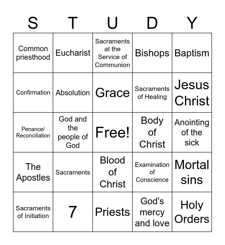 This bingo card has a free space and 24 words: Sacraments, 7, Grace, Sacraments of Initiation, Baptism, Common priesthood, Confirmation, Eucharist, Body of Christ, Blood of Christ, Sacraments of Healing, Penance/ Reconciliation, Examination of Conscience, Mortal sins, Absolution, God's mercy and love, Anointing of the sick, Sacraments at the Service of Communion, Jesus Christ, God and the people of God, Holy Orders, The Apostles, Bishops and Priests.