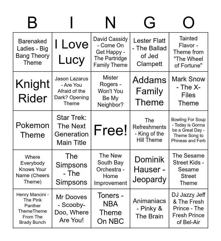 This bingo card has a free space and 72 words: The Andy Griffith Theme, I Love Lucy, Star Trek: The Next Generation Main Title, The Spelding's Jazz Orchestra - Mission impossible, The Flintstones -, The TV Theme Players - The Jetsons, Lester Flatt - The Ballad of Jed Clampett, Ron Grainer - Doctor Who Theme, Addams Family Theme, Duck Tales Theme - From "Duck Tales", Henry Mancini - The Pink Panther ThemeTheme From The Brady Bunch, Pratt & McClain - Happy Days, Mark Snow - The X-Files Theme, Barenaked Ladies - Big Bang Theory Theme, Michael Scott Fan Club - The Office Theme, Pokemon Theme, Dominik Hauser - Jeopardy, Tainted Flavor - Theme from "The Wheel of Fortune", Family Feud, Bowling For Soup - Today is Gonna be a Great Day - Theme Song to Phineas and Ferb, The Simpsons - The Simpsons, DJ Jazzy Jeff & The Fresh Prince - The Fresh Prince of Bel-Air, The Sesame Street Kids - Sesame Street Theme, Dominik Hauser - The Twilight Zone, Dora The Explorer, Hannah Montana - The Best of Both Worlds, The Rembrandts - I'll Be There for You - Theme From "Friends", Selena Gomez - Everything Is Not As It Seems - Series Theme Song, Rockapella - Where in the World Is Carmen Sandiego?, The Superstation - Everywhere You Look- Full House, Mr Dooves - Scooby-Doo, Where Are You!, Mort Stevens And His Orchestra - Hawaii Five-O, Eddie Albert - Green Acres, The Muppet Show Theme, Animaniacs - Pinky & The Brain, The A Team, Seinfeld, Game of Thrones, Knight Rider, MASH, The New South Bay Orchestra - Home Improvement, The Edwin Davids Jazz Band - Roseanne, Kris Kirspe - E.R, Dee Jag - Futurama, The Munsters Theme, Where Everybody Knows Your Name (Cheers Theme), Those Were the Days (All in the Family Theme), The Golden Girls, Stranger Things, John Sebastian - Welcome Back (Theme from Welcome Back, Kotter), Saved By The Bell, Painty The Pirate and Kids - SpongeBob SquarePants Theme, Jack Jones - Love Boat Theme, The Refreshments - King of the Hill Theme, Mike Post - The Theme of Law & Order, Inner Circle - Bad Boys (Theme from COPS), David Cassidy - Come On Get Happy - The Partridge Family Theme, Mister Rogers - Won't You Be My Neighbor?, Paula Cole - I Don't Want to Wait- Dawson's Creek, Fraggle Rock Theme, Jan Hammer - Miami Vice Theme, Bear McCreary - Theme from the Walking Dead, Da Family - Family Matters (Intro), Toners - NBA Theme On NBC, Jessica -Top Gear Main Theme, Jack Lenz - Goosebumps Original Theme Song, Jason Lazarus - Are You Afraid of the Dark? Opening Theme, TLC - All That (Theme Song), Gilligan's Island Theme, Gary Portnoy - Punky Brewster Theme, Geek Music - Rugrats and Rocko's Modern Life.