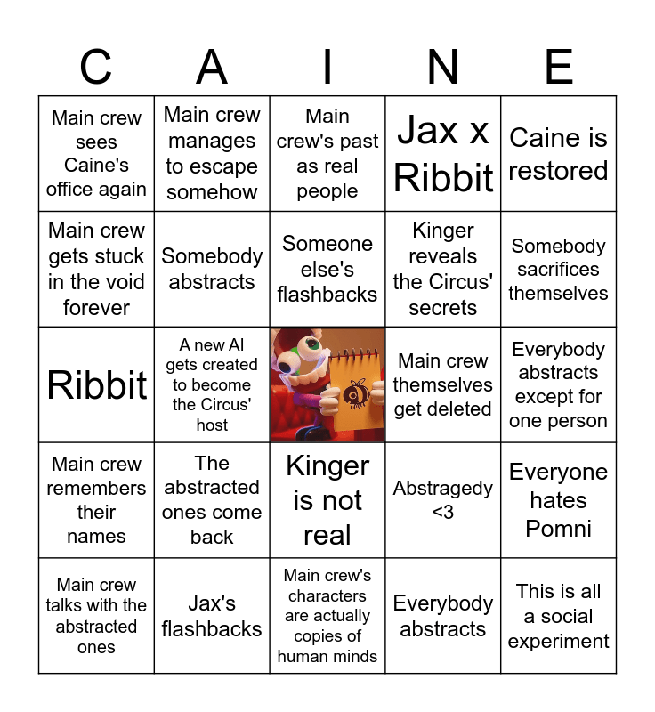 This bingo card has a free space and 24 words: The abstracted ones come back, Jax's flashbacks, Someone else's flashbacks, Main crew talks with the abstracted ones, Caine is restored, Main crew sees Caine's office again, Main crew gets stuck in the void forever, Main crew manages to escape somehow, Main crew themselves get deleted, Kinger is not real, Kinger reveals the Circus' secrets, Ribbit, Abstragedy <3, Everyone hates Pomni, Somebody abstracts, Everybody abstracts, Everybody abstracts except for one person, Main crew's past as real people, Somebody sacrifices themselves, A new AI gets created to become the Circus' host, This is all a social experiment, Main crew remembers their names, Jax x Ribbit and Main crew's characters are actually copies of human minds.
