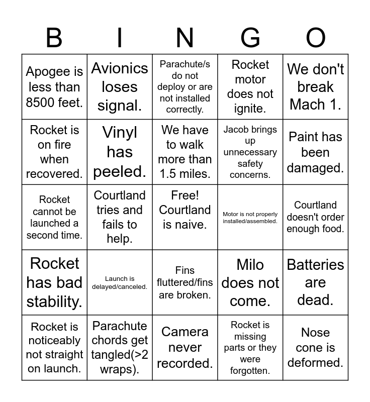 This bingo card has a free space and 24 words: Launch is delayed/canceled., Parachute chords get tangled(>2 wraps)., We have to walk more than 1.5 miles., Rocket is noticeably not straight on launch., We don't break Mach 1., Apogee is less than 8500 feet., Rocket is on fire when recovered., Avionics loses signal., Motor is not properly installed/assembled., Fins fluttered/fins are broken., Jacob brings up unnecessary safety concerns., Rocket cannot be launched a second time., Milo does not come., Batteries are dead., Vinyl has peeled., Rocket is missing parts or they were forgotten., Courtland doesn't order enough food., Parachute/s do not deploy or are not installed correctly., Paint has been damaged., Courtland tries and fails to help., Nose cone is deformed., Rocket has bad stability., Rocket motor does not ignite. and Camera never recorded..
