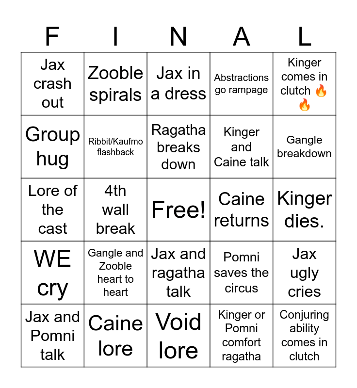 This bingo card has a free space and 24 words: Jax and Pomni talk, Gangle and Zooble heart to heart, Ragatha breaks down, Kinger or Pomni comfort ragatha, Kinger comes in clutch 🔥🔥, Jax crash out, Zooble spirals, Jax in a dress, Caine returns, Kinger dies., Lore of the cast, Ribbit/Kaufmo flashback, Pomni saves the circus, Jax ugly cries, Group hug, Caine lore, Void lore, Abstractions go rampage, Gangle breakdown, WE cry, 4th wall break, Jax and ragatha talk, Kinger and Caine talk and Conjuring ability comes in clutch.