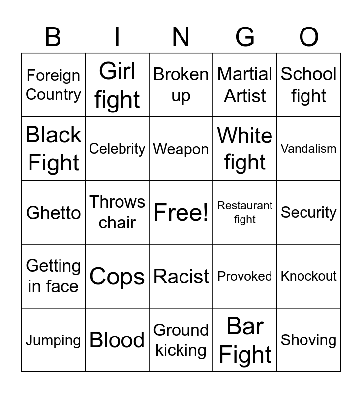 This bingo card has a free space and 24 words: Cops, Blood, Weapon, Jumping, School fight, Foreign Country, Black Fight, Girl fight, Restaurant fight, Racist, White fight, Ghetto, Provoked, Knockout, Celebrity, Bar Fight, Security, Broken up, Vandalism, Throws chair, Shoving, Getting in face, Martial Artist and Ground kicking.