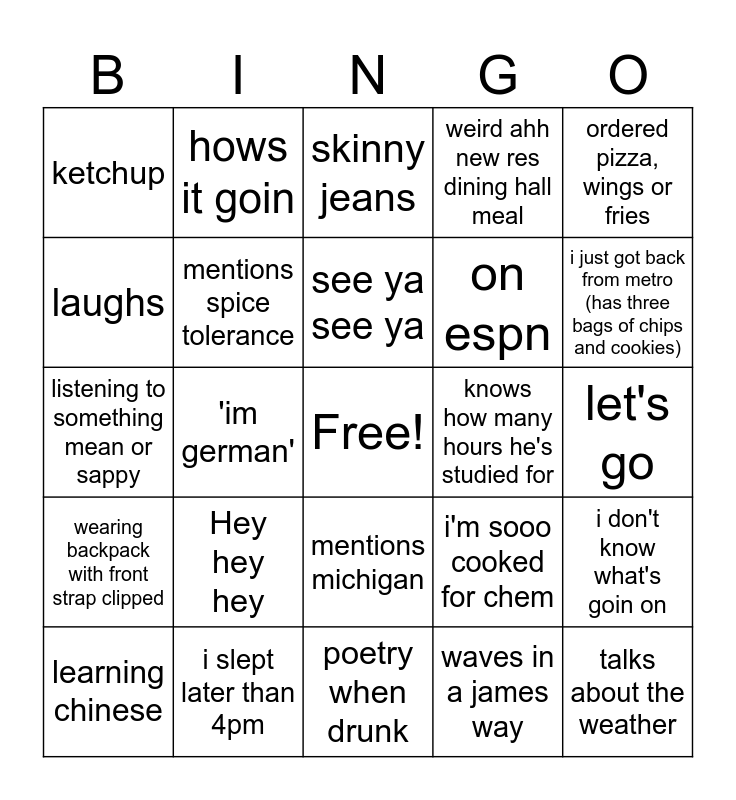 This bingo card has a free space and 24 words: Hey hey hey, i slept later than 4pm, see ya see ya, learning chinese, ordered pizza, wings or fries, ketchup, laughs, hows it goin, knows how many hours he's studied for, mentions michigan, on espn, listening to something mean or sappy, i'm sooo cooked for chem, i don't know what's goin on, mentions spice tolerance, waves in a james way, let's go, skinny jeans, i just got back from metro (has three bags of chips and cookies), 'im german', talks about the weather, wearing backpack with front strap clipped, weird ahh new res dining hall meal and poetry when drunk.