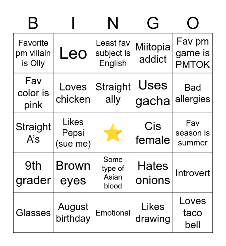 This bingo card has a free space and 24 words: Brown eyes, August birthday, Straight ally, Glasses, Fav pm game is PMTOK, Favorite pm villain is Olly, Fav color is pink, Leo, Cis female, Some type of Asian blood, Uses gacha, Straight A’s, Hates onions, Introvert, Loves chicken, Likes drawing, Fav season is summer, Least fav subject is English, Bad allergies, Likes Pepsi (sue me), Loves taco bell, 9th grader, Miitopia addict and Emotional.