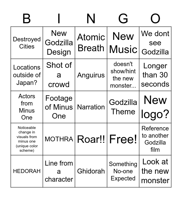 This bingo card has 25 words: MOTHRA, Ghidorah, Anguirus, HEDORAH, We dont see Godzilla, Destroyed Cities, Locations outside of Japan?, New Godzilla Design, Godzilla Theme, Roar!!, doesn't show/hint the new monster..., Actors from Minus One, Free!, Reference to another Godzilla film, Shot of a crowd, Look at the new monster, New logo?, Atomic Breath, Longer than 30 seconds, Footage of Minus One, Narration, Line from a character, Noticeable change in visuals from minus one (unique color scheme), New Music and Something No-one Expected.