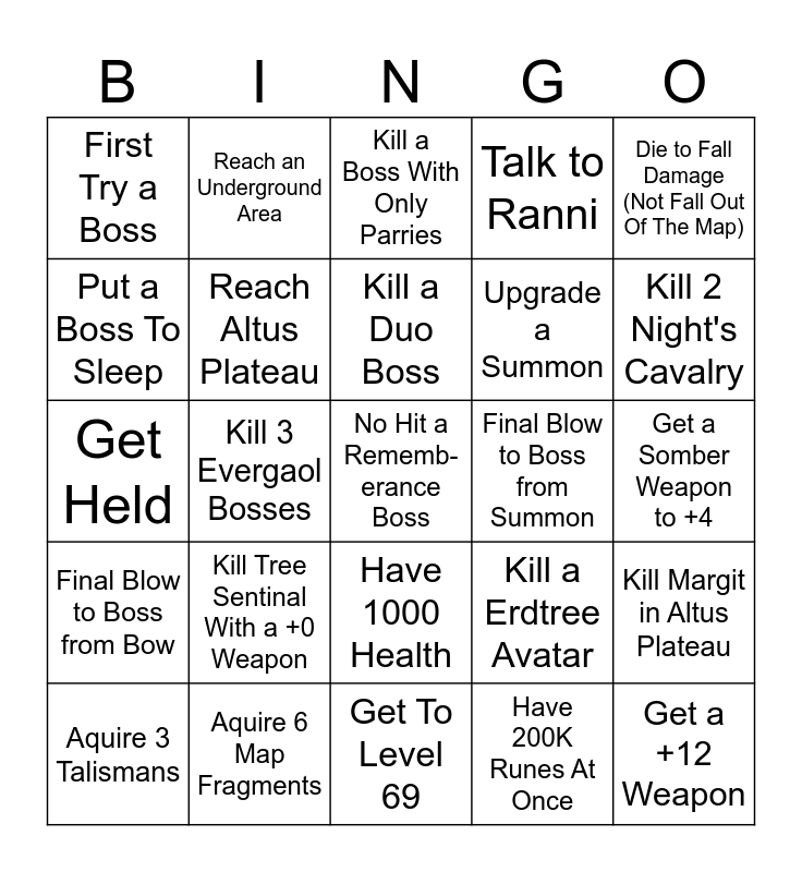 This bingo card has a free space and 24 words: Kill Tree Sentinal With a +0 Weapon, Aquire 6 Map Fragments, Kill a Duo Boss, Aquire 3 Talismans, Die to Fall Damage (Not Fall Out Of The Map), First Try a Boss, Put a Boss To Sleep, Reach an Underground Area, Final Blow to Boss from Summon, Have 1000 Health, Upgrade a Summon, Get Held, Kill a Erdtree Avatar, Kill Margit in Altus Plateau, Reach Altus Plateau, Have 200K Runes At Once, Get a Somber Weapon to +4, Kill a Boss With Only Parries, Kill 2 Night's Cavalry, Kill 3 Evergaol Bosses, Get a +12 Weapon, Final Blow to Boss from Bow, Talk to Ranni and Get To Level 69.