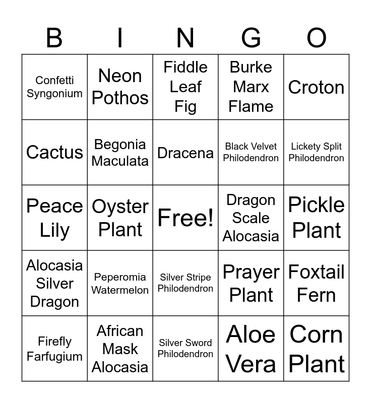 This bingo card has a free space and 61 words: African Violet, African Mask Alocasia, Air Plant, Alocasia Silver Dragon, Aloe Vera, Asparagus Fern, Begonia Maculata, Bird of Paradise, Black Velvet Philodendron, Boston Fern, Burke Marx Flame, Butterfly Synonium, Cactus, Chinese Evergreen Lady Valentine, Congo Rojo Philodendron, Confetti Syngonium, Corn Plant, Croton, Diffenbachia, Dracena, Dragon Scale Alocasia, Fiddle Leaf Fig, Firefly Farfugium, Foxtail Fern, Golden Pothos, Jade Satin Pothos, Jade, Jose Bueno Phjilodendron, Lickety Split Philodendron, Marble Peperomia, Marble Queen Pothos, Money Tree, Monstera Deliciosa, Moonshine Ficus, Neon Pothos, N’Joy Pothos, Ogre Ears, Oyster Plant, Parlor Palm, Peace Lily, Peperomia Ginny, Peperomia Watermelon, Pickle Plant, Ponytail Palm, Prayer Plant, Regal Shield Alocasia, Ring of Fire Philodendron, Rubber Plant, Schefflera, Silver Stripe Philodendron, Silver Sword Philodendron, Snake Moonshine, Spider Plant, Staghorn Fern, Sun Red Philodendron, Swiss Cheese Monstera, Tineke Fig, Thailand Peperomia, Tiny Dancer Alocasia, Tricolor Hoya and ZZ Plant.