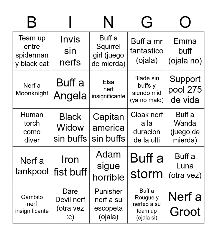 This bingo card has a free space and 24 words: Iron fist buff, Dare Devil nerf (otra vez :c), Elsa nerf insignificante, Gambito nerf insignificante, Emma buff (ojala no), Team up entre spiderman y black cat, Nerf a Moonknight, Invis sin nerfs, Cloak nerf a la duracion de la ulti, Adam sigue horrible, Blade sin buffs y siendo mid (ya no malo), Human torch como diver, Buff a storm, Buff a Luna (otra vez), Buff a Angela, Buff a Rougue y nerfeo a su team up (ojala si), Buff a Wanda (juego de mierda), Buff a Squirrel girl (juego de mierda), Support pool 275 de vida, Black Widow sin buffs, Nerf a Groot, Nerf a tankpool, Buff a mr fantastico (ojala) and Punisher nerf a su escopeta (ojala).