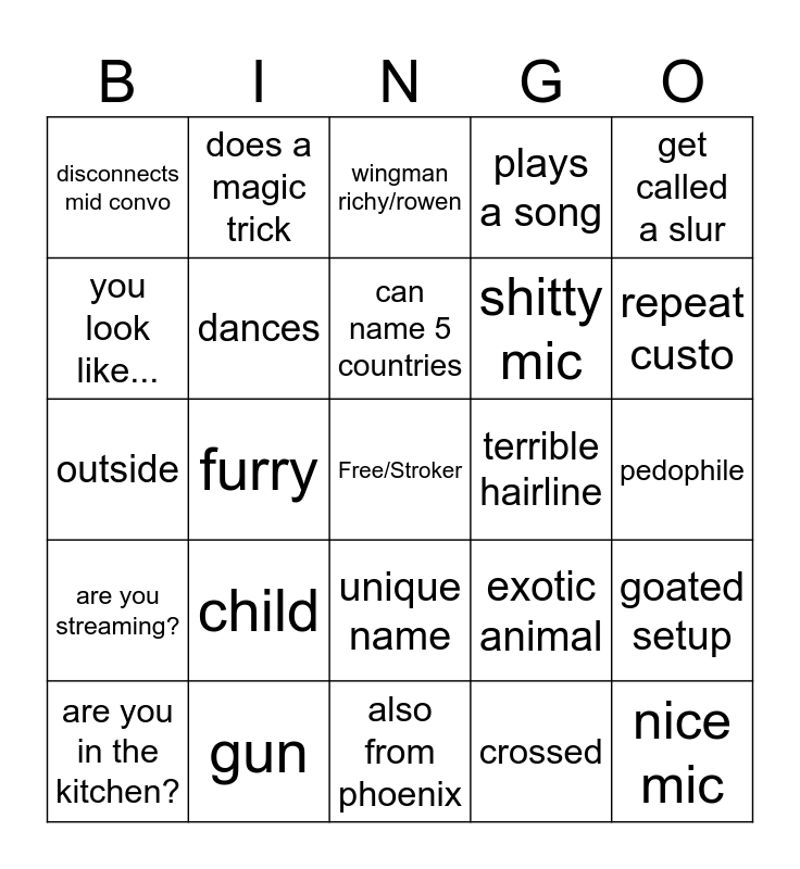 This bingo card has a free space and 24 words: are you in the kitchen?, child, can name 5 countries, crossed, get called a slur, disconnects mid convo, does a magic trick, wingman richy/rowen, terrible hairline, pedophile, outside, dances, exotic animal, goated setup, you look like..., gun, also from phoenix, plays a song, repeat custo, are you streaming?, furry, unique name, shitty mic and nice mic.