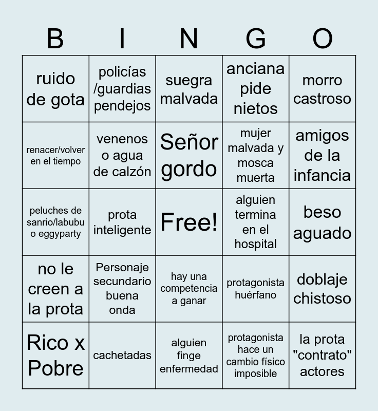 This bingo card has a free space and 24 words: Rico x Pobre, Personaje secundario buena onda, Señor gordo, protagonista hace un cambio físico imposible, morro castroso, ruido de gota, policías /guardias pendejos, suegra malvada, alguien termina en el hospital, beso aguado, peluches de sanrio/labubu o eggyparty, venenos o agua de calzón, protagonista huérfano, doblaje chistoso, renacer/volver en el tiempo, cachetadas, alguien finge enfermedad, anciana pide nietos, amigos de la infancia, no le creen a la prota, prota inteligente, hay una competencia a ganar, mujer malvada y mosca muerta and la prota "contrato" actores.