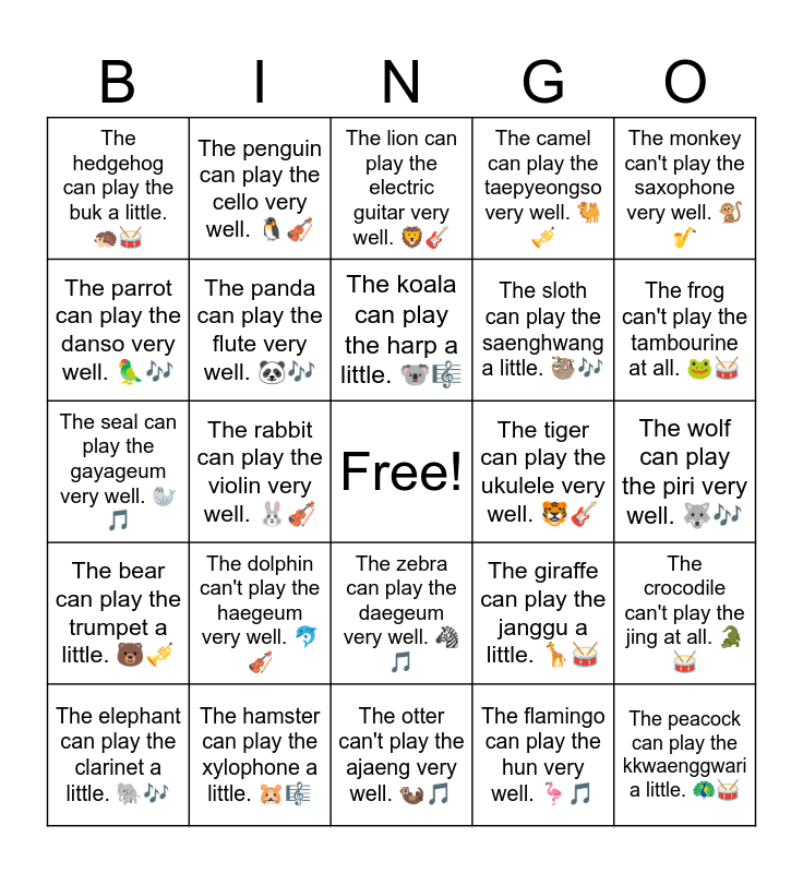 This bingo card has a free space and 33 words: The cat can play the piano very well. π±πΉ, The dog can play the guitar a little. πΆπΈ, The rabbit can play the violin very well. π°π», The fox can't play the drums very well. π¦π₯, The bear can play the trumpet a little. π»πΊ, The panda can play the flute very well. πΌπΆ, The monkey can't play the saxophone very well. ππ·, The elephant can play the clarinet a little. ππΆ, The penguin can play the cello very well. π§π», The squirrel can't play the trombone very well. πΏοΈπΊ, The koala can play the harp a little. π¨πΌ, The lion can play the electric guitar very well. π¦πΈ, The raccoon can't play the bassoon very well. π¦πΆ, The owl can play the keyboard a little. π¦πΉ, The tiger can play the ukulele very well. π―πΈ, The frog can't play the tambourine at all. πΈπ₯, The hamster can play the xylophone a little. πΉπΌ, The seal can play the gayageum very well. π¦π΅, The dolphin can't play the haegeum very well. π¬π», The giraffe can play the janggu a little. π¦π₯, The zebra can play the daegeum very well. π¦π΅, The kangaroo can't play the geomungo very well. π¦π΅, The hedgehog can play the buk a little. π¦π₯, The wolf can play the piri very well. πΊπΆ, The otter can't play the ajaeng very well. π¦¦π΅, The peacock can play the kkwaenggwari a little. π¦π₯, The camel can play the taepyeongso very well. π«πΊ, The sloth can play the saenghwang a little. π¦₯πΆ, The parrot can play the danso very well. π¦πΆ, The crocodile can't play the jing at all. ππ₯, The whale can play the sogeum a little. ππΆ, The flamingo can play the hun very well. π¦©π΅ and The rhinoceros can't play the nabal at all. π¦πΊ.
