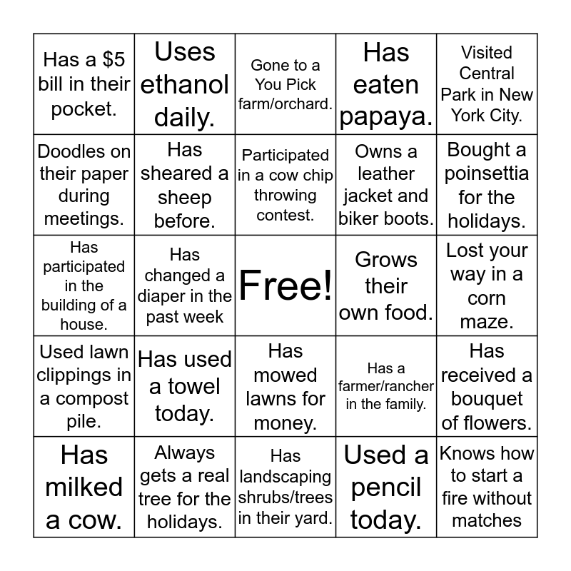 This bingo card has a free space and 24 words: Has used a towel today., Always gets a real tree for the holidays., Participated in a cow chip throwing contest., Has milked a cow., Visited Central Park in New York City., Has a $5 bill in their pocket., Doodles on their paper during meetings., Uses ethanol daily., Grows their own food., Has mowed lawns for money., Owns a leather jacket and biker boots., Has participated in the building of a house., Has a farmer/rancher in the family., Has received a bouquet of flowers., Has sheared a sheep before., Used a pencil today., Lost your way in a corn maze., Gone to a You Pick farm/orchard., Bought a poinsettia for the holidays., Has changed a diaper in the past week, Knows how to start a fire without matches, Used lawn clippings in a compost pile., Has eaten papaya. and Has landscaping shrubs/trees in their yard..