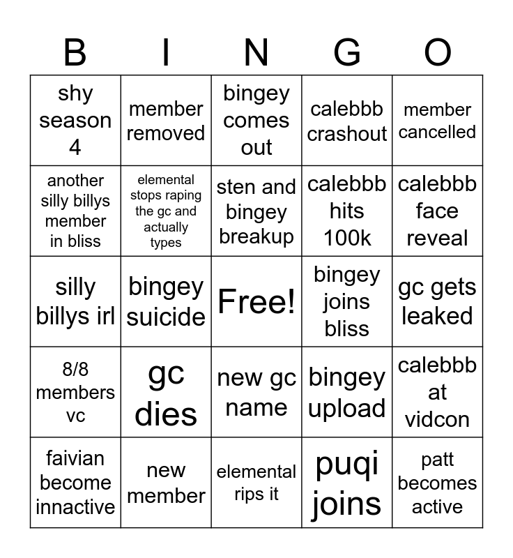 This bingo card has a free space and 24 words: gc dies, new member, sten and bingey breakup, faivian become innactive, member cancelled, shy season 4, another silly billys member in bliss, member removed, bingey joins bliss, new gc name, calebbb hits 100k, silly billys irl, bingey upload, calebbb at vidcon, elemental stops raping the gc and actually types, puqi joins, gc gets leaked, bingey comes out, calebbb face reveal, bingey suicide, patt becomes active, 8/8 members vc, calebbb crashout and elemental rips it.