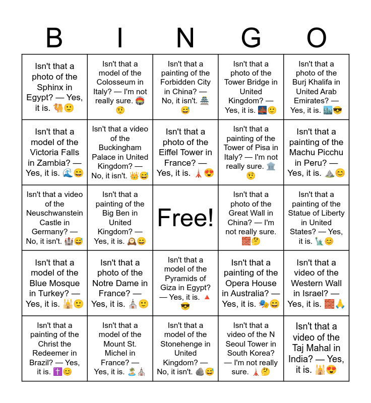 This bingo card has a free space and 33 words: Isn't that a photo of the Acropolis in Greece? β Yes, it is. ποΈπ, Isn't that a video of the Angkor Wat in Cambodia? β I'm not really sure. ππ€, Isn't that a painting of the Big Ben in United Kingdom? β Yes, it is. π°οΈπ, Isn't that a photo of the Blue Domes of Oia in Greece? β Yes, it is. βͺπ, Isn't that a model of the Blue Mosque in Turkey? β Yes, it is. ππ, Isn't that a video of the Buckingham Palace in United Kingdom? β No, it isn't. ππ , Isn't that a photo of the Burj Khalifa in United Arab Emirates? β Yes, it is. ποΈπ, Isn't that a painting of the Christ the Redeemer in Brazil? β Yes, it is. βοΈπ, Isn't that a model of the Colosseum in Italy? β I'm not really sure. ποΈπ€¨, Isn't that a video of the Easter Island in Chile? β Yes, it is. πΏπ΄, Isn't that a photo of the Eiffel Tower in France? β Yes, it is. πΌπ, Isn't that a painting of the Forbidden City in China? β No, it isn't. π―π , Isn't that a model of the Giantβs Causeway in United Kingdom? β Yes, it is. πͺ¨π, Isn't that a video of the Golden Gate Bridge in United States? β Yes, it is. ππ, Isn't that a photo of the Great Wall in China? β I'm not really sure. π§±π€, Isn't that a painting of the Machu Picchu in Peru? β Yes, it is. β°οΈπ, Isn't that a model of the Mount St. Michel in France? β Yes, it is. ποΈβͺ, Isn't that a video of the Neuschwanstein Castle in Germany? β No, it isn't. π°π , Isn't that a photo of the Notre Dame in France? β Yes, it is. βͺπ, Isn't that a painting of the Opera House in Australia? β Yes, it is. ππ, Isn't that a model of the Pyramids of Giza in Egypt? β Yes, it is. πΊπ, Isn't that a video of the Sagrada Familia in Spain? β I'm not really sure. βͺπ€, Isn't that a photo of the Sphinx in Egypt? β Yes, it is. π«π, Isn't that a painting of the Statue of Liberty in United States? β Yes, it is. π½π, Isn't that a model of the Stonehenge in United Kingdom? β No, it isn't. πͺ¨π , Isn't that a video of the Taj Mahal in India? β Yes, it is. ππ, Isn't that a photo of the Tower Bridge in United Kingdom? β Yes, it is. ππ, Isn't that a painting of the Tower of Pisa in Italy? β I'm not really sure. ποΈπ€¨, Isn't that a model of the Victoria Falls in Zambia? β Yes, it is. ππ, Isn't that a video of the Western Wall in Israel? β Yes, it is. π§±π, Isn't that a photo of the Gyeongbokgung Palace in South Korea? β Yes, it is. π―π, Isn't that a video of the N Seoul Tower in South Korea? β I'm not really sure. πΌπ€ and Isn't that a painting of the Jeju Island in South Korea? β Yes, it is. π΄π.