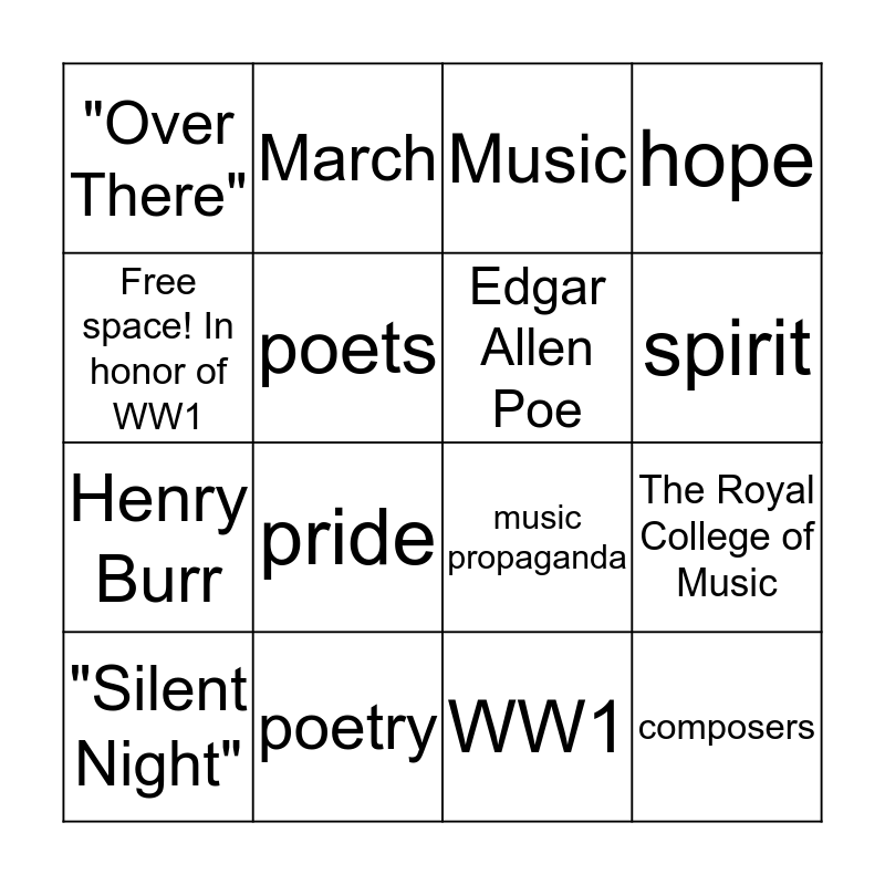 This bingo card has 16 words: poetry, The Royal College of Music, Music, "Over There", Henry Burr, March, music propaganda, WW1, Free space! In honor of WW1, poets, "Silent Night", hope, pride, spirit, Edgar Allen Poe and composers.