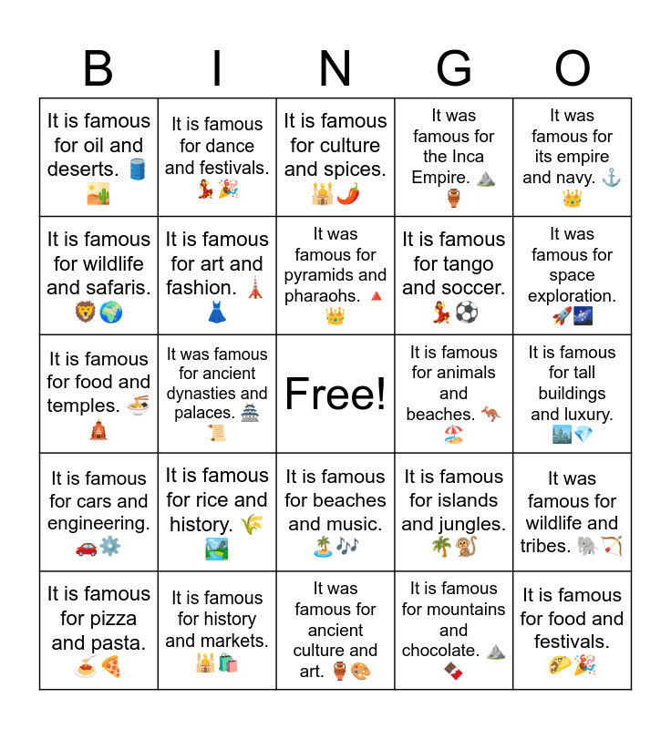 This bingo card has a free space and 33 words: It is famous for K-pop and technology. 📱🎶, It is famous for movies and Hollywood. 🎬⭐, It was famous for ancient dynasties and palaces. 🏯📜, It is famous for anime and technology. 🎌📺, It is famous for cars and engineering. 🚗⚙️, It is famous for art and fashion. 🗼👗, It was famous for its empire and navy. ⚓👑, It is famous for pizza and pasta. 🍝🍕, It is famous for dance and festivals. 💃🎉, It was famous for ancient philosophy and temples. 🏛️📚, It was famous for pyramids and pharaohs. 🔺👑, It is famous for culture and spices. 🕌🌶️, It is famous for soccer and carnival. ⚽🎉, It is famous for nature and maple syrup. 🍁🥞, It is famous for animals and beaches. 🦘🏖️, It was famous for space exploration. 🚀🌌, It is famous for history and markets. 🕌🛍️, It is famous for food and temples. 🍜🛕, It is famous for rice and history. 🌾🏞️, It is famous for islands and jungles. 🌴🐒, It is famous for beaches and music. 🏝️🎶, It was famous for horse riders and empires. 🐎🏹, It is famous for oil and deserts. 🛢️🏜️, It is famous for tall buildings and luxury. 🏙️💎, It was famous for ancient culture and art. 🏺🎨, It is famous for food and festivals. 🌮🎉, It was famous for the Inca Empire. ⛰️🏺, It is famous for tango and soccer. 💃⚽, It is famous for wildlife and safaris. 🦁🌍, It was famous for wildlife and tribes. 🐘🏹, It is famous for tulips and windmills. 🌷🌬️, It is famous for mountains and chocolate. ⛰️🍫 and It was famous for religion and history. 🕍📜.
