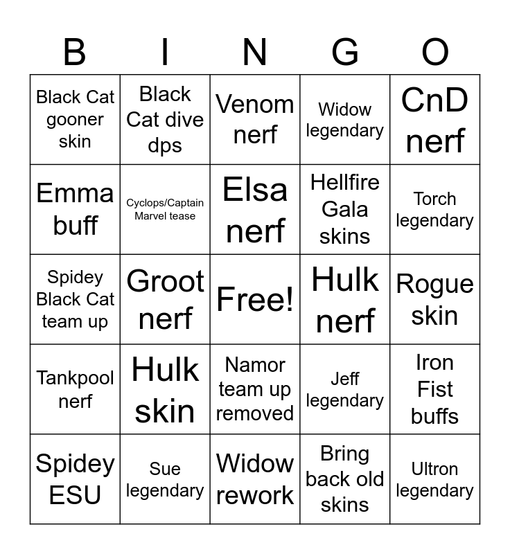 This bingo card has a free space and 24 words: Hulk skin, Sue legendary, Elsa nerf, Spidey ESU, CnD nerf, Black Cat gooner skin, Emma buff, Black Cat dive dps, Hulk nerf, Namor team up removed, Hellfire Gala skins, Spidey Black Cat team up, Jeff legendary, Iron Fist buffs, Cyclops/Captain Marvel tease, Bring back old skins, Rogue skin, Venom nerf, Torch legendary, Groot nerf, Ultron legendary, Tankpool nerf, Widow legendary and Widow rework.