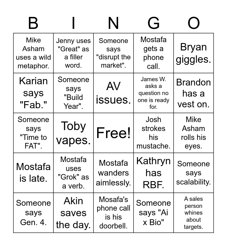 This bingo card has a free space and 24 words: Mostafa uses "Grok" as a verb., Akin saves the day., AV issues., Someone says Gen. 4., Bryan giggles., Mike Asham uses a wild metaphor., Karian says "Fab.", Jenny uses "Great" as a filler word., Josh strokes his mustache., Mostafa wanders aimlessly., James W. asks a question no one is ready for., Someone says "Time to FAT"., Kathryn has RBF., Someone says scalability., Someone says "Build Year"., Someone says "Ai x Bio", Mike Asham rolls his eyes., Someone says "disrupt the market"., Brandon has a vest on., Toby vapes., A sales person whines about targets., Mostafa is late., Mostafa gets a phone call. and Mosafa's phone call is his doorbell..