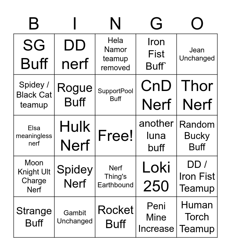 This bingo card has a free space and 24 words: Spidey Nerf, Gambit Unchanged, SupportPool Buff, Strange Buff, Jean Unchanged, SG Buff, Spidey / Black Cat teamup, DD nerf, another luna buff, Nerf Thing's Earthbound, CnD Nerf, Elsa meaningless nerf, Loki 250, DD / Iron Fist Teamup, Rogue Buff, Peni Mine Increase, Random Bucky Buff, Hela Namor teamup removed, Thor Nerf, Hulk Nerf, Human Torch Teamup, Moon Knight Ult Charge Nerf, Iron Fist Buff` and Rocket Buff.