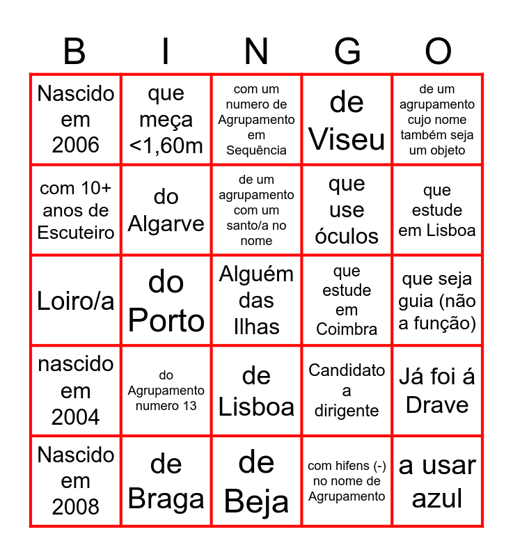 This bingo card has a free space and 24 words: do Agrupamento numero 13, de Braga, de um agrupamento com um santo/a no nome, Nascido em 2008, de um agrupamento cujo nome também seja um objeto, Nascido em 2006, com 10+ anos de Escuteiro, que meça <1,60m, que estude em Coimbra, de Lisboa, que use óculos, Loiro/a, Candidato a dirigente, Já foi á Drave, do Algarve, com hifens (-) no nome de Agrupamento, que seja guia (não a função), com um numero de Agrupamento em Sequência, que estude em Lisboa, do Porto, a usar azul, nascido em 2004, de Viseu and de Beja.