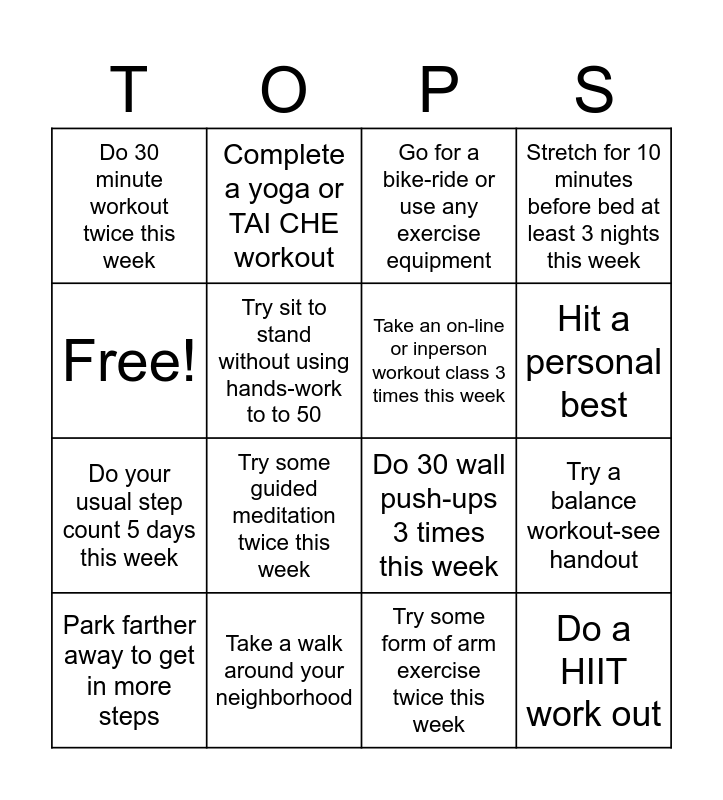 This bingo card has 16 words: Take a walk around your neighborhood, Try a balance workout-see handout, Go for a bike-ride or use any exercise equipment, Do 30 minute workout twice this week, Do your usual step count 5 days this week, Complete a yoga or TAI CHE workout, Do 30 wall push-ups 3 times this week, Try some form of arm exercise twice this week, Free!, Try sit to stand without using hands-work to to 50, Park farther away to get in more steps, Stretch for 10 minutes before bed at least 3 nights this week, Try some guided meditation twice this week, Hit a personal best, Take an on-line or inperson workout class 3 times this week and Do a HIIT work out.