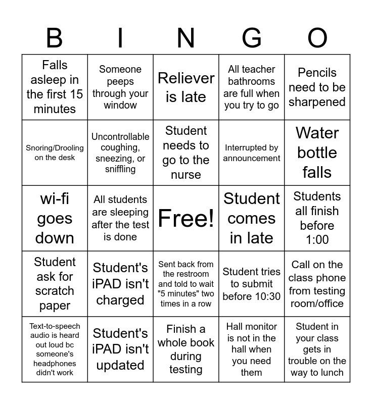 This bingo card has a free space and 24 words: Student's iPAD isn't charged, Student's iPAD isn't updated, Student needs to go to the nurse, Text-to-speech audio is heard out loud bc someone's headphones didn't work, Pencils need to be sharpened, Falls asleep in the first 15 minutes, Snoring/Drooling on the desk, Someone peeps through your window, Student comes in late, Sent back from the restroom and told to wait "5 minutes" two times in a row, Interrupted by announcement, wi-fi goes down, Student tries to submit before 10:30, Call on the class phone from testing room/office, Uncontrollable coughing, sneezing, or sniffling, Hall monitor is not in the hall when you need them, Students all finish before 1:00, Reliever is late, Water bottle falls, All students are sleeping after the test is done, Student in your class gets in trouble on the way to lunch, Student ask for scratch paper, All teacher bathrooms are full when you try to go and Finish a whole book during testing.
