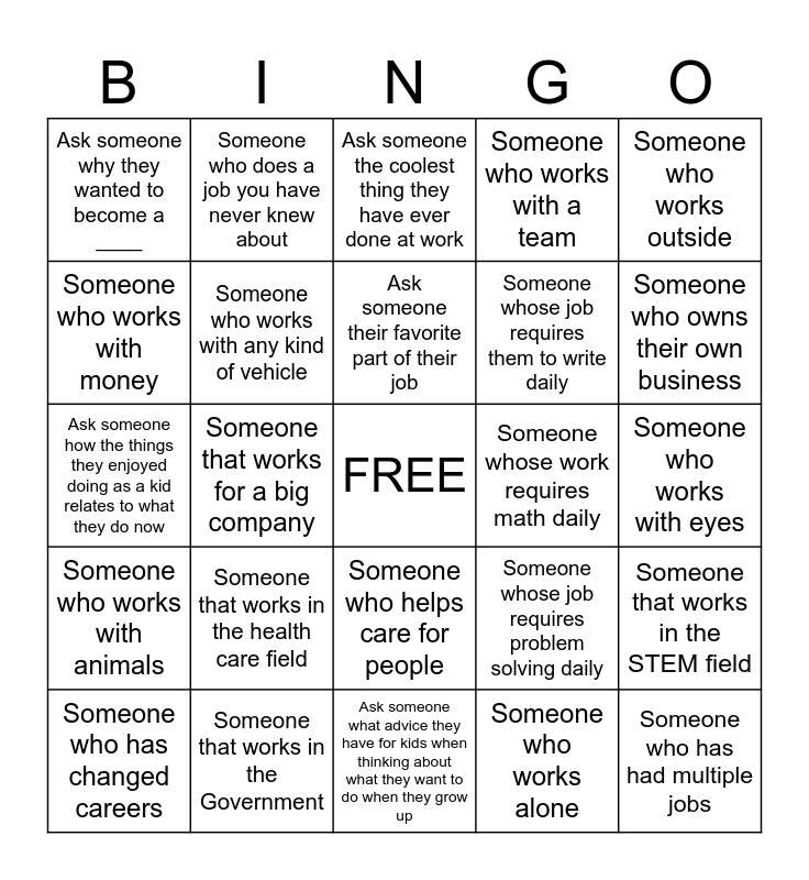 This bingo card has a free space and 24 words: Someone that works in the health care field, Someone that works in the Government, Ask someone their favorite part of their job, Someone who has changed careers, Someone who works outside, Ask someone why they wanted to become a ____, Someone who works with money, Someone who does a job you have never knew about, Someone whose work requires math daily, Someone who helps care for people, Someone whose job requires them to write daily, Ask someone how the things they enjoyed doing as a kid relates to what they do now, Someone whose job requires problem solving daily, Someone that works in the STEM field, Someone who works with any kind of vehicle, Someone who works alone, Someone who works with eyes, Ask someone the coolest thing they have ever done at work, Someone who owns their own business, Someone that works for a big company, Someone who has had multiple jobs, Someone who works with animals, Someone who works with a team and Ask someone what advice they have for kids when thinking about what they want to do when they grow up.