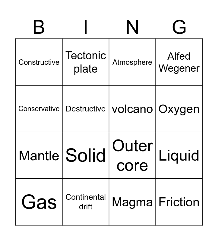 This bingo card has 25 words: Nitrogen, Carbon dioxide, Oxygen, Hydrogen, Conservative, Constructive, Destructive, Tectonic plate, Continental drift, Crust, Mantle, Outer core, Inner core, Mountain, volcano, Earthquake, Magma, Atmosphere, Solid, Liquid, Gas, Boundary, Friction, Alfed Wegener and Air.