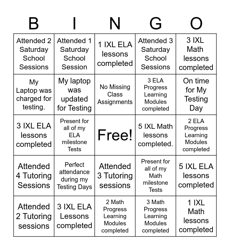 This bingo card has a free space and 24 words: Perfect attendance during my Testing Days, 3 IXL ELA Lessons completed, No Missing Class Assignments, Attended 2 Tutoring sessions, 3 IXL Math lessons completed, Attended 2 Saturday School Sessions, My Laptop was charged for testing., Attended 1 Saturday School Session, 5 IXL Math lessons completed., Attended 3 Tutoring sessions, 3 ELA Progress Learning Modules completed, 3 IXL ELA lessons completed, Present for all of my Math milestone Tests, 5 IXL ELA lessons completed, My laptop was updated for Testing, 3 Math Progress Learning Modules completed, 2 ELA Progress Learning Modules completed, 1 IXL ELA lessons completed, On time for My Testing Day, Present for all of my ELA milestone Tests, 1 IXL Math lessons completed, Attended 4 Tutoring Sessions, Attended 3 Saturday School Sessions and 2 Math Progress Learning Modules completed.