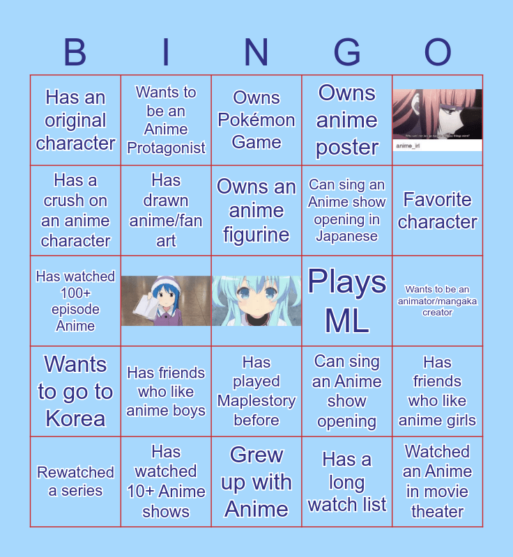 This bingo card has 4 images and 33 words: Has cosplayed an anime character, Owns manga, Owns Anime Merch, Has drawn anime/fan art, Has friends who like anime girls, Has friends who like anime boys, Owns an anime figurine, Has finished a 10+ episode within 48 hours, Owns anime poster, Wants to be an animator/mangaka creator, Has a crush on an anime character, Wants to go to Korea, Free!, Owns Pokémon Game, Has played Maplestory before, Plays ML, Has an original character, Favorite character, Rewatched a series, Grew up with Anime, Watched a Studio Ghibli film, Has a long watch list, Wants to be an Anime Protagonist, Wants to be an Anime Antagonist, Plays Smash Bros, Plays Mario Kart, Favorite Pokémon Pikachu, Has watched 10+ Anime shows, Has watched 100+ episode Anime, Watched an Anime in movie theater, Can sing an Anime show opening, Can sing an Anime show opening in Japanese and Can quote an Anime character in their original Japanese.
